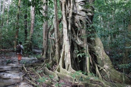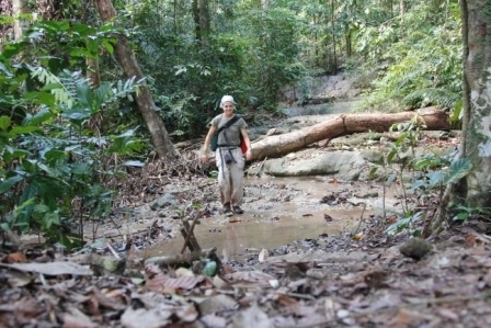 I trekked into a new part of the forest yesterday to see what the forest was like up there, how much human disturbance there was and if there was any evidence of monkeys. The locals estimated it would take 3 – 4 hours to walk in as it is uphill, through rivers. My guide, Hussein, and I did it in under 2 hours! Amazing walk – starting from a village 30 min drive from my base camp village. First you pass through cashew nut plantations, then coffee and cocoa plantations and finally cross the river into mixed forest cropping of plants like clove under the canopy. Gradually as you walk up the rivers and waterfalls the forest changes and the trees get larger. It’s truly beautiful forest – stunning. It’s not devoid of human activity but there is little evidence of logging – rather the area is used to harvest rattan (a palm used to make furniture), honey and hunting the endemic Anoa (a dwarf buffalo).
