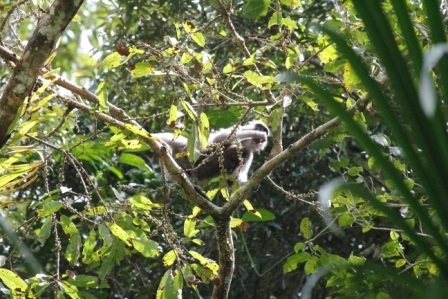 Two of the troops I study live in secondary forest or a forest-farm mosaic landscape. This means they spend quite a lot of time on the ground and I can get fairly close (within 10m). The third troop live a couple of hours into the forest – a mix of secondary and primary forest. The trees are taller here and the monkeys have little reason to come to the ground. This makes finding them and observing them that much harder!