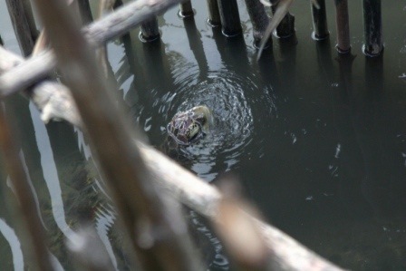 Reptiles aren’t immune to these threats either. The giant frogs which inhabit the streams here are hunted for food and very occasionally salt-water crocodiles are trapped and kept in small pits as pets. Turtles are also trapped and kept either tied up to jetties or in small wooden cages in the water. Their eggs are also collected and sold at the market.